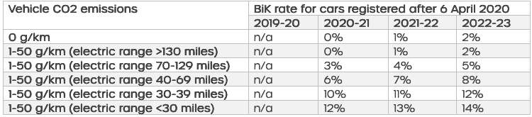 Benefit in Kind (BiK) rates are shown in the table below. These percentages are applied to the full retail value of the vehicle including all extras you may have fitted.