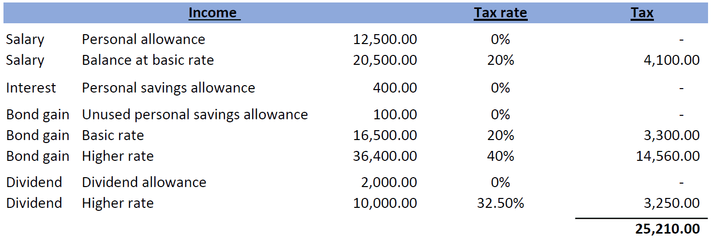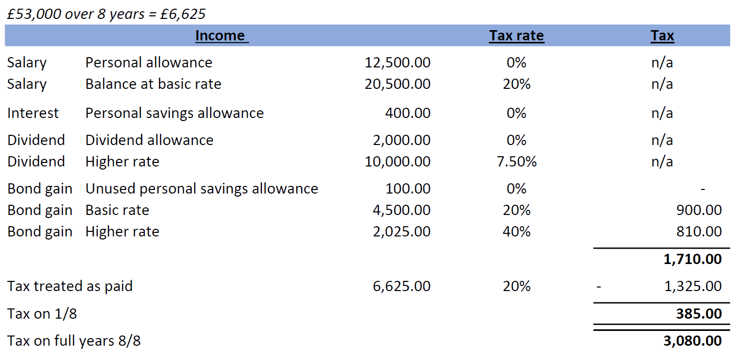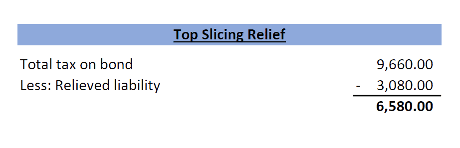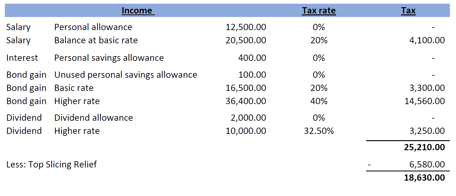 Overall, the impact of the top slicing relief in the above example is to reduce the tax paid on the bond gain from 38% (£25,210 less the tax one would have paid if only receiving dividends, salary and interest of £4,850) to 26% (£18,630 less the £4,850).