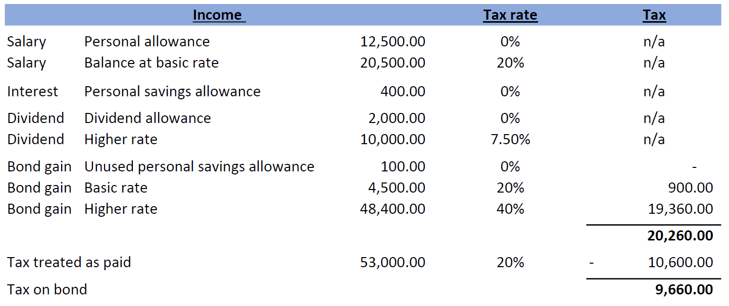 Calculate the notional tax on the full bond due, and further deduct ‘tax treated as paid’ which is 20% (This may be reduced if any unused personal allowance is set against the gain). i.e. assuming the bond gain is taxed last.